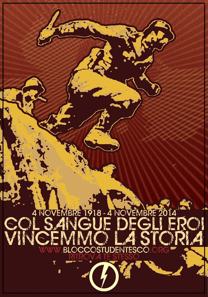 Nell’anno in cui ricorre il Centenario della Grande Guerra, vediamo delineata, nel nostro Paese, una situazione di profonda crisi che attanaglia tanto l’aspetto socio-economico quanto la sfera strettamente privata. Obiettivo del Blocco Studentesco è, come delineato anche nel nuovo programma, l’acquisizione di una coscienza storica che consenta, o quantomeno getti le basi per consentire, alla nostra giovinezza, di acquisire consapevolezza di ciò che fù.